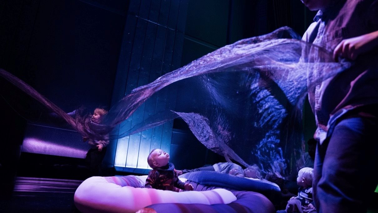 Velkommen inn i en danseforestilling for barn mellom 3 måneder - 2 år og deres voksne, der to dansere og en musiker skaper et fantasifullt rom.